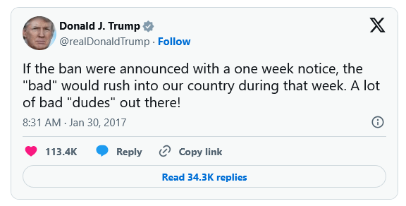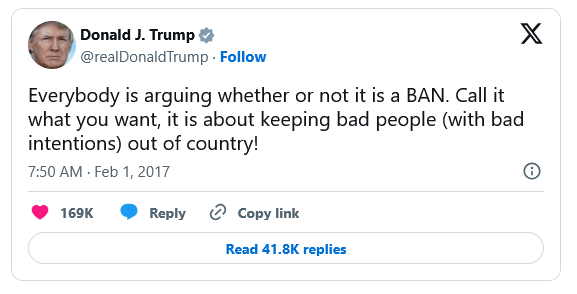 Spicer made this rather testy comment in public, even though his boss had said just the day before, “If the ban were announced with a one week notice, the “bad” would rush into our country during that week. A lot of bad “dudes” out there!” (italics ours). Clearly president Trump called his executive order on immigration a “ban” .