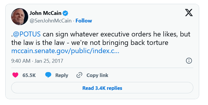 On Thursday, Speaker of the House Paul Ryan said the US would not engage in torture, and Senator John McCain, a fellow Republican and a prisoner of war who was tortured in Vietnam, has come out even more strongly on Twitter.